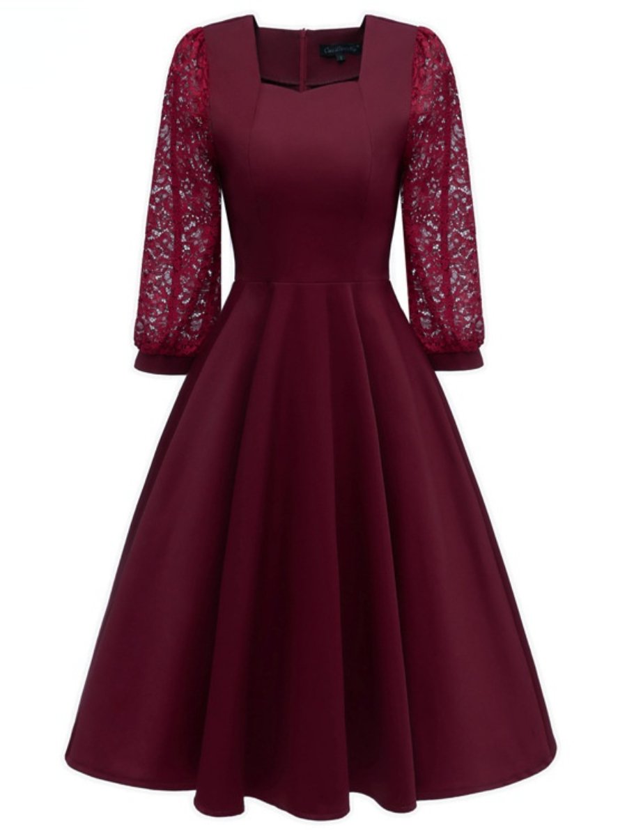 Burgundy Dress Square Neck Lantern Lace Sleeves Midi Swing Dresses