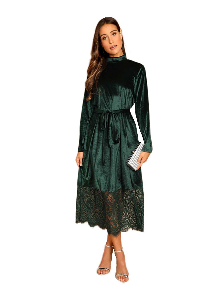 Elegant Lady Dress Long Sleeve Solid Color Lace Hem Velvet Dress