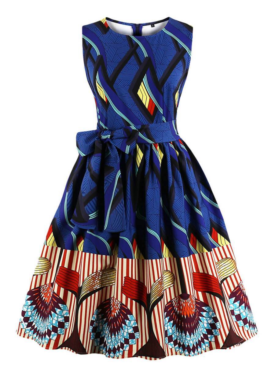 Ethnic Dress Print O Neck Sleeveless Dress for Women