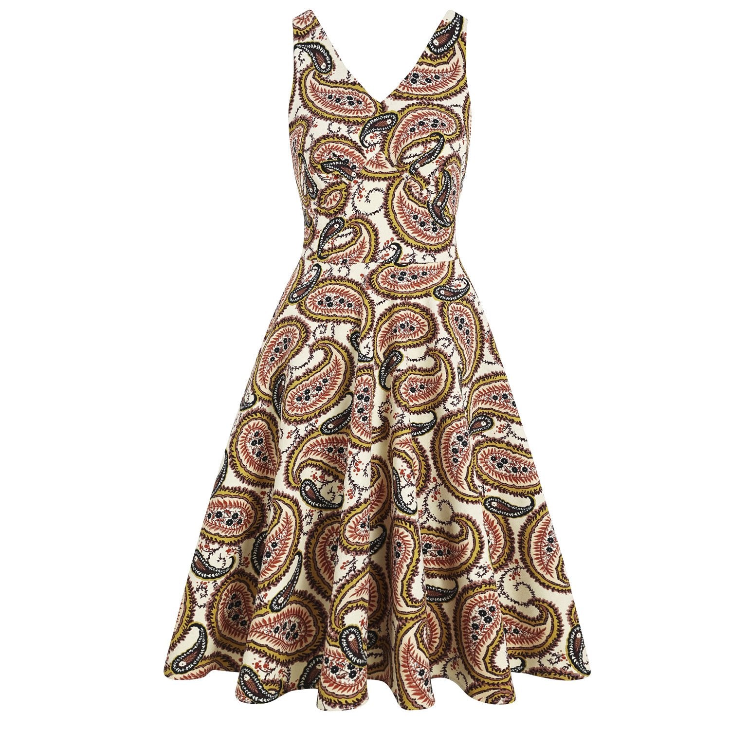 Spaghetti Strap Dress Deep V-Neck Paisley Print Backless Midi Swing Dress