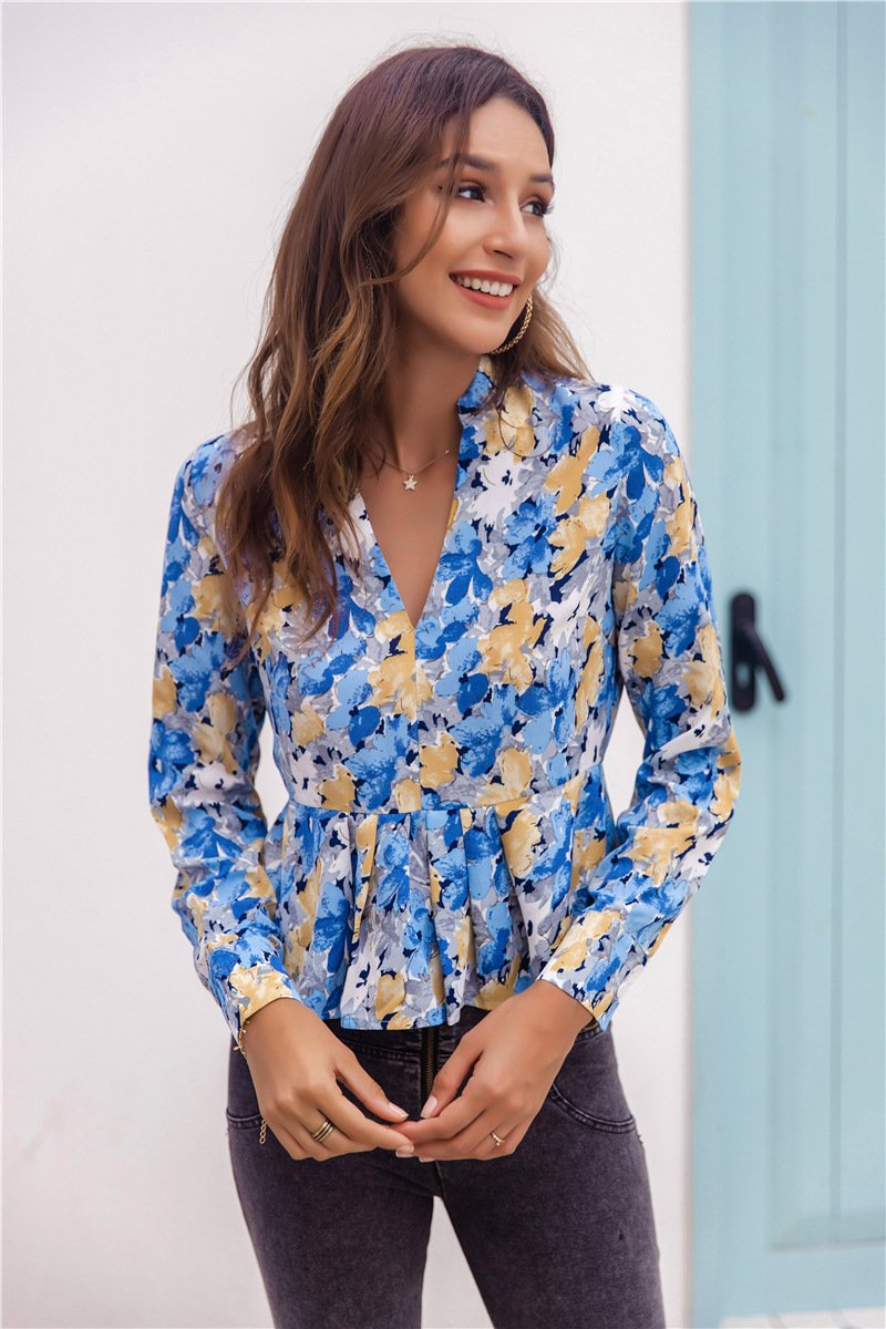 Women's Blouses Floral V-Neck Ruffled Hem Long Sleeve Elegant Top