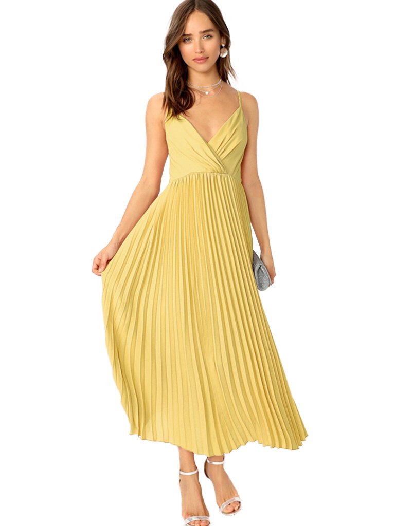 Womens Casual Dress V-neck Pleated Spaghetti Strap Long Dress
