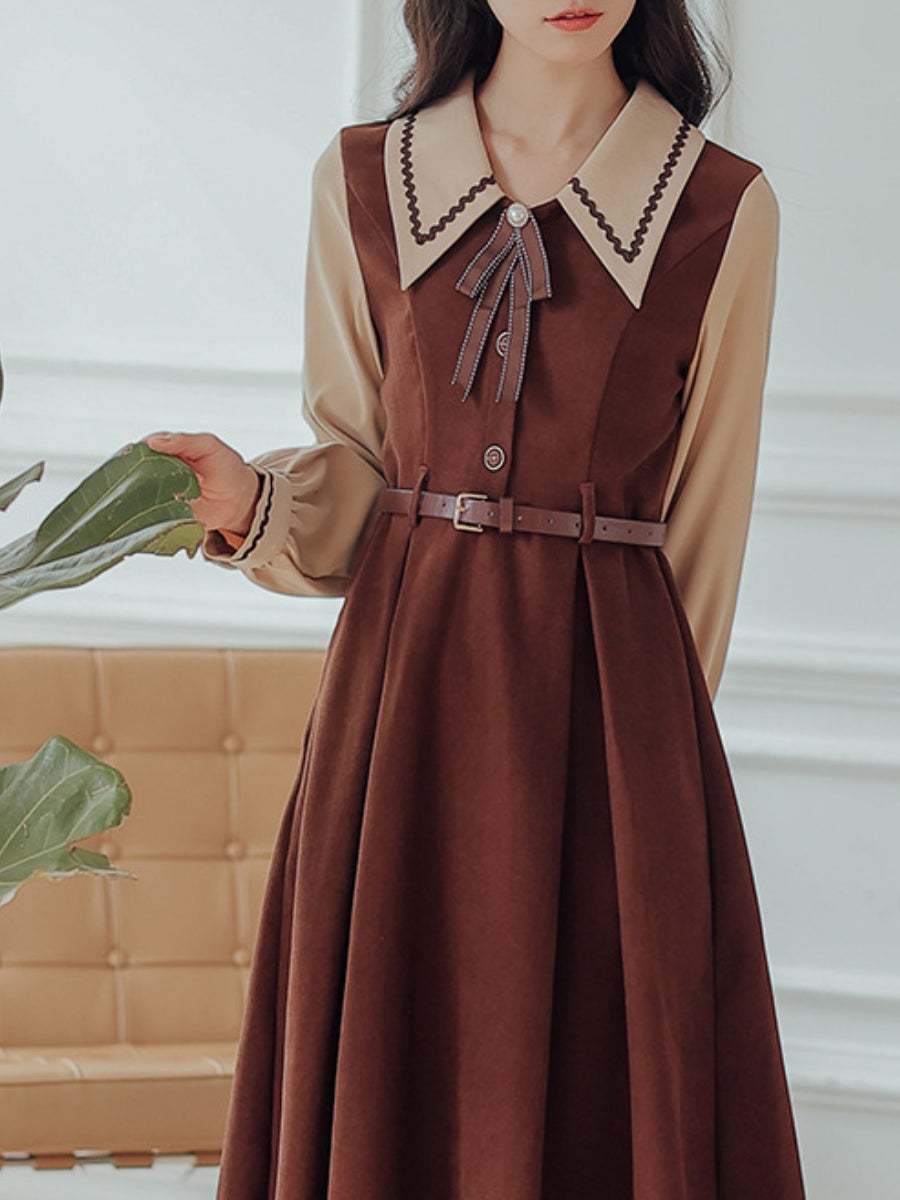 Women's Dresses Lapel Long Sleeve Retro Contrast Stitching Midi Dresses