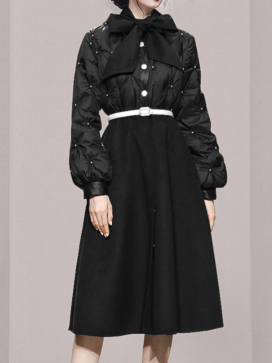 Women's Winter Coats Bowknot Single-breasted Studded Bead Stitching High Waist Dress Coats